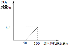 (2)据图甲可以看出,当加入盐酸的量为50g时开始产生二氧化碳,当加入盐酸的量为100g时不再生成二氧化碳,设产生二氧化碳的质量为x,则有