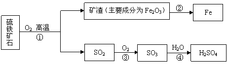 ¹¤ÒµÉÏÓÃÁòÌú¿óʯ£¨Ö÷Òª³É·ÖFeS2£©ÔÚ·ÐÌÚ¯ÖбºÉÕ£¬¾¹ýһϵÁз´Ó¦£¬µÃµ½ÁòËá¡£±ºÉÕºóµÄ¿óÔüÓÃÓÚÁ¶Ìú¡£Æäת»¯¹ý³ÌÈçÏ£¨²¿·ÖÌõ¼þºÍ²úÎïÒÑÂÔÈ¥£©¡£