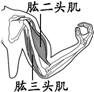 解答 解:骨骼肌中间较粗的部分叫肌腹,两端较细的呈乳白色的部分叫肌腱.肌腱可绕过关节连在不同的骨上.骨骼肌有受刺激而收缩的特性,当骨骼肌受神经传来的刺激收缩时,就会牵动骨绕着关节活动,于是躯体就会产生运动.肱二头肌和肱三头肌交替收缩和舒张,可引起肘关节的屈伸.屈肘时,肱二头肌收缩,肱三头肌舒张.如图:![]()