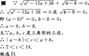 分析:本题是二次根式的内容与三角形的边、角相等关系的综合,而解决本题的关键是如何利用题中的条件求出a、b的值,这里主要是抓住 方法提炼:利用非负数之和为0,知这些数都为0,这是从一道方程中求多个未知数的常用方法.在此以前我们已用了代数式的平方与绝对值等非负数之和为0,现在学了二次根式后,也可以用于本题类似的题型;另外,在与相关的知识联系时,要找准突破口,使问题变简单. |