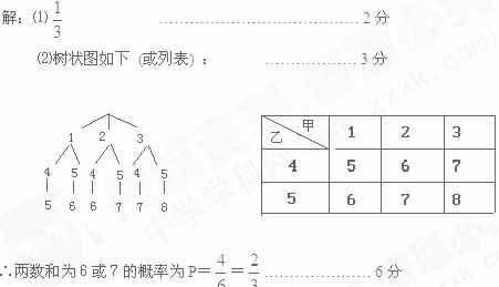 ⑵ 分别转动图甲和图乙的指针,两个指针停止时所指区域内的数之和为6或7,试用树状图或列表法求出其概率.
