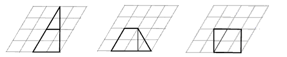 如图所示,在4×4的菱形斜网格图中(每一个小菱形的边长为1,有一个角是60°),菱形ABCD的边长为2,E是AD的中点,按CE将菱形ABCD剪成①、②两部分,用这两部分可以分别拼成直角三角形、等腰梯形、矩形,要求所拼成图形的顶点均落在格点上。