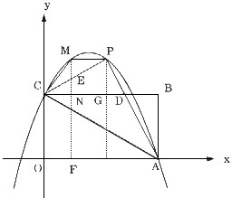 | (3)假设存在这样的点M,使得四边形MCAP的面积最大 ∵△ACP面积为定值, ∴要使四边形MCAP的面积最大,只需使△PCM的面积最大 过点M作MF⊥x轴分别交CP、CB和x轴于E、N和F,过点P作PG⊥x轴交CB于G 设M(x0,y0), ∵∠ECN=30°,CN=x0,∴EN= ∴ME=MF-EF=- ∴ ∵a=- ∴S有最大值 当x0= ∵ ∴四边形MCAP的面积的最大值为 此时M点的坐标为( 所以存在这样的点M( |