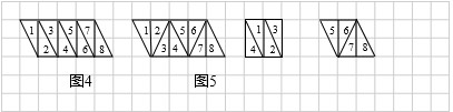 (2)将图5的平行四边形用不同于(1)的分割方案,分割成面积相等的八个三角形,再将这八个三角形适当组合拼成两个面积相等且不全等的平行四边形,类比图2,图3,用数字1至8标明。