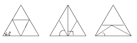 正三角形给人以“稳如泰山”的美感,它具有独特的对称性,请你用三种不同的分割方法,将下列三个正三角形分别分割成四个等腰三角形(在图中画出分割线,并标出必要的角的度数)