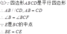 如图,在□ABCD中,E是BC的中点,连接AE并延长交DC的延长线于点F.![]()