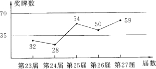 解答:解:由折线统计图可以看出:23届到24届是递减的趋势,24届到25届是递增的趋势,25届到26届是递减的趋势,26届到27届是递增的趋势;24届的奖牌数为28枚,25届的奖牌数为54枚,增长了54-28=26枚;26届为50枚,27届为59枚,则增加了59-50=9枚;则第25届比它的上一届奖牌数增加得最多;邻两届之间奖牌数呈递增趋势的有两段,分别是24届到25届和26届到27届.