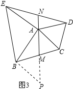 (3)如图3,当∠BAC≠90°时,∠BAE=α°,∠CAD=(180-α)°,则线段DE与AM的大小关系怎样?其夹角∠DNM是多少?请给出证明.