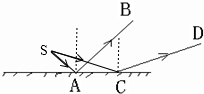 第二种作法:先过A点垂直镜面作出法线,在法线左侧指向入射点画出入射光线,注意反射角要等于入射角,同理画出反射光线CD的入射光线,两条入射光线的交点S即为发光点的位置,如图所示:
