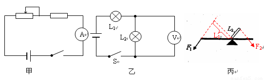 试题分析:图甲为串联电路,只需将各电路元件符号按顺序连接即可;在图乙中,根据电流方向分析,左测为电源,且正极在上,负极在下,右侧接电压表,因为它与L2并联;在图丙中,根据力臂与力的作用线垂直来作图。