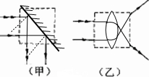 分析:仔细观察各图中出射光线和入射光线的特点,结合各种透镜及面镜的光学特点,找到合适的光学元件.