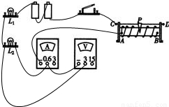 【答案】分析:由题意要求可知两电阻串联,电压表并联在L2两端,电流表直接接在电路中;实物图连接时,首先将电池串接起来,再依次将各串联部分的各电器串接;注意两表量程的选择,同时注间滑动变阻器的接法,导线不能交叉.