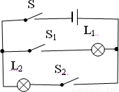 解答:解:闭合开关,电流从电源正极出来后,出现分支:一支到灯泡L1,然后依次流经开关S1和S,回到电源负极;另一条支路经开关S2后流向灯泡L2,经开关S回到电源负极.故电路图如下: