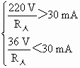 解题指导:由欧姆定律知R= 当人接触220 V电压时,人有危险,此时人体中的电流一定大于30 mA, 当人接触低于36 V电压时,人没有危险,此时人体中的电流一定小于30 mA, 由欧姆定律结合以分析可得 1.2×103<R人<7.3×l03Ω,显然R人与1×l03Ω最接近. |