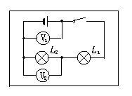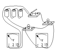 实验课上,老师给出了两个电压表,两个灯泡,一个开关,一个电池组,若干导线,要求测出两个灯泡串联时各自的电压和电池组的电压,请你在图2-8中将所给的器材连接起来,并将你设计的电路图画在方框内。