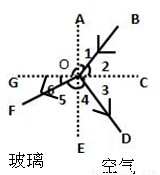 解答:解:由图可以看出∠2=∠3,根据反射光线、入射光线与法线之间的夹角相等,可以确定BO、OD中一条为入射光线,一条为反射光线;折射光线和入射光线分居法线两侧,且不在同一介质中,可以确定BO、FO一条为入射光线,一条为折射光线,结合上面分析,因此BO一定为入射光线,OD为反射光线,FO为折射光线,即GC为法线,AE为界面,∠2是入射角,∠3是反射角,∠6是折射角,又因为∠6<∠2,所以光是从空气斜射入玻璃中,AE界面右侧是空气.如图所示: