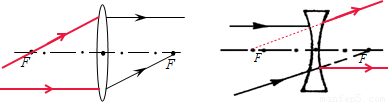 (2)对于凹透镜,平行于主光轴的光线经凹透镜折射后,其折射光线的反向延长线过焦点;延长线过另一侧焦点的光线经凹透镜折射后将平行于主光轴,如图所示: