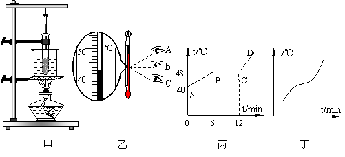 ÊÔÌâ·ÖÎö£º½«×°ÓÐÀ¯¡¢º£²¨µÄÊԹֱܷð·ÅÔÚʢˮµÄÉÕ±ÄÚ¼ÓÈÈ£¬¶ø²»ÊÇÖ±½ÓÓþƾ«µÆ¼ÓÈÈ£¬Ä¿µÄÊÇΪÁËʹÊÔ¹ÜÄÚµÄÎïÖÊÊÜÈȾùÔÈ£»Î¶ȼƶÁÊýʱÊÓÏßÒªÓëζȼÆÖÐÒºÖùÉϱíÃæÏàÆ½£¬¹ÊBÕýÈ·£»Î¶ȼƵÄʾÊýÔÚ40Óë50¡æÖ®¼ä£¬·Ö¶ÈÖµµÈÓÚ1¡æ£¬ËùÒÔÊÇ42¡æ£»±ûͼÓÐÒ»¶Îζȱ£³Ö²»±äµÄ¹ý³Ì£¬ËµÃ÷ÒÒÊǾ§Ì壬Õâ¸ö¹ý³ÌËù¶ÔÓ¦µÄζȾÍÊǸþ§ÌåµÄÈ۵㣬´ÓͼÖпÉÒÔ¿´³öÈÛµãÊÇ48¡æ£»ÓÉͼ֪£¬AB¶Î»¹Ã»ÓÐÈÛ»¯£¬ËùÒÔÊǹÌ̬£»BC¶ÎÔÚÈÛ»¯¹ý³ÌÖУ¬ÊǹÌ̬¹²´æÌ¬£»CD¶ÎÒÑÍêÈ«ÈÛ»¯Í꣬ÊÇҺ̬£®µÚ10minº£²¨ÈÔÈ»´¦ÓÚÈÛ»¯×´Ì¬£¬ËùÒÔÊǹÌÒº¹²´æ¡£À¯ÊǷǾ§Ì壬À¯ÔÚÈÛ»¯¹ý³ÌÖÐζȲ»¶ÏÉÏÉý¡£