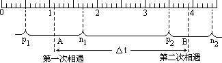 ¡¡¡¡(3)ÈçͼËùʾ£¬·¢³öp1ÐźźóÔÚAÓëÆû³µÏàÓö£¬¶ÔӦʱ¿ÌΪµÚÒ»´ÎÏàÓöʱ¿ÌA£¬·¢³öp2ÐźźóÔÚB´¦ÓëÆû³µÏàÓö£¬¶ÔӦʱ¿ÌΪµÚ¶þ´ÎÏàÓöʱ¿ÌB£¬ÏÔÈ»¡÷tÖ®¼äÓÐ4¸ñ£«20¸ñ£«4¸ñ£½28¸ñ£¬Æû³µÓÉAÔ˶¯µ½BµÄʱ¼äΪ£º¡÷t£½28¡Á