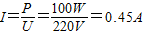 答:灯泡工作时的电流是0.45A,工作5h用电0.5度电.