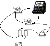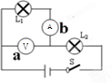 (2)在乙图中,要想使两灯串联,b表必须是电流表,这样就把亮灯串起来了,a表必须是电压表,测量灯泡L1两端的电压.如下图: