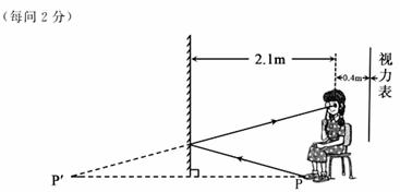 检查视力时,视力表放在被测者头部的后上方,被测者识别对面墙上平面镜里的像。要求视力表在平面镜中的像与被测者相距4. 6m,试在图中准确画出:(l)平面镜的位置;(2)被测者眼睛通过平面镜看到自己右脚上如图P点的光路图。