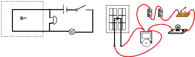 设计一个家庭门窗报警的装置:给你一个电压电池组、一只灯、一只开关、一只电铃和若干细导线,请你设计一个家庭门窗报警的装置.要求:合上开关后,屋内灯亮而铃不响;当有人推开窗户连接在窗户上的细导线被拉断时,电铃便会响起来,从而报警.请按设计的要求在方框中画出电路图并将图中元件连成电路.