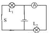 在图12所示的电路中,根据标出的电流方向,选用电源、电流表、电压表三个元件符号中的两个,分别填进电路图的空缺处,填进后要求灯泡L1和L2并联。