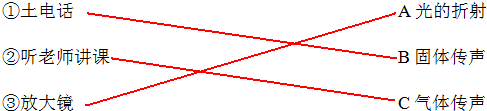 根据声音可以在不同的介质中传播,以及放大镜的原理来进行连线即可.
