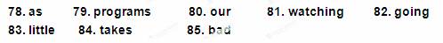 But ___81____TV too much has a bad influence on us. Many people watch TV instead of___82_____ out for healthy outdoor activities. They lose themselves in TV programs. They have _____83____ time to have sports. It is not good for their health. It also ___84_____ up too much time and keeps us away from our study. And not everything on TV has positive(正面的) effects on viewers. Some TV programs are not suitable for children. They show crime (暴力) and others that are ___85_____for children. Parents should help their children choose the proper programs and help them go out to do more exercise.