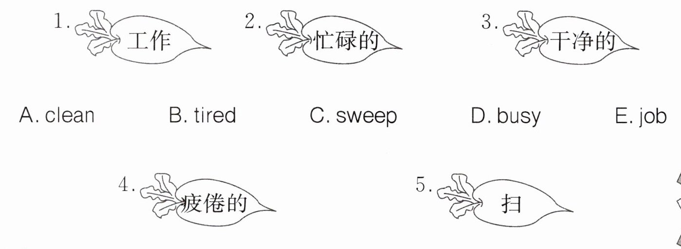 1.A teacher(老师)和 C nurse(护士)都是具体的职业名称,而 B job 是“工作”的统称,不同类。 2.B busy(忙碌的)和 C tired(疲惫的)是形容词描述状态,而 A help(帮助)是动词,不同类。 3.A clean(打扫)和 B make(制作)是动词,而 C child(孩子)是名词,不同类。 4.A great(棒的)和 B helpful(有帮助的)是形容词,而 C sweep(打扫)是动词,不同类。 5.A factory(工厂)和 C office(办公室)是具体的地点场所,而 B people(人们)是名词指人,不同类。