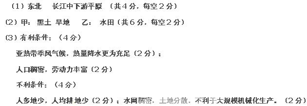 (3)甲乙两地区都是我国重要的商品粮生产基地。请指出乙地与甲地相比,其在农业生产条件方面所具有的有利和不利条件?(8分)