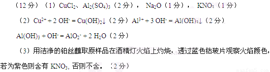 £¨12·Ö£©ÓÐÒ»°ü·Ûĩ״¹ÌÌ壬¿ÉÄÜÊÇÓÉAl2(SO4)3¡¢CuCl2¡¢KNO3¡¢Na2OÖеÄÒ»ÖÖ»ò¼¸ÖÖ×é³ÉµÄ¡£ÎªÁË̽¾¿ËüµÄ³É·Ö£¬Ä³Ñ§Ï°Ð¡×é×öÁËÈçÏÂʵÑé¡£