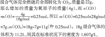 现有CO和CO2的混合气体18 g,完全燃烧后得到的气体的体积为11.2 L(标准状况),质量是22 g,则原混合气体中CO2的质量为________g,CO的物质的量为________mol,混合气体在标准状况下的密度是________.