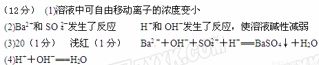 (12分)在烧杯里加入20 mL 0.1 mol/L的Ba(OH)2溶液,再滴几滴酚酞试液,然后用滴定管向烧杯中滴加等物质的量浓度的NaHSO4溶液。实验装置如下图(夹持仪器已去掉):
