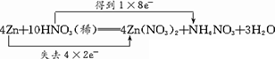 63∶260 4Zn+10H++ 解析:反应中,改变化合价的元素是Zn和N,箭头要从反应物指向生成物,4 mol Zn失去8 mol e-,10 mol HNO3中只有1 mol HNO3得到电子,N的化合价从HNO3中的+5价变为NH4NO3中的-3价; 氧化剂和还原剂的质量比是1 mol HNO3和4 mol Zn的质量比即:63∶260; HNO3、Zn(NO3)2、NH4NO3是易溶于水的强电解质,改写为离子形式,两边删除9 mol |