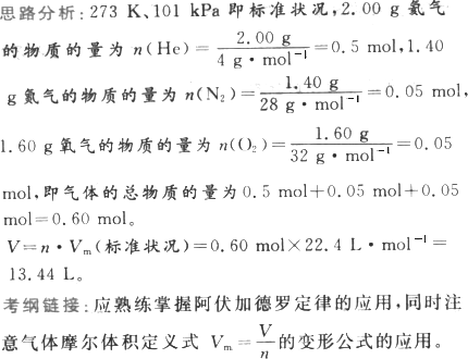 在273 K和101 kPa的条件下,将2.00 g氦气,1.40 g氮气和1.60 g氧气混合,该混合气体的体积是 | |
