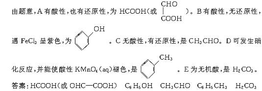 ÓÐA¡¢B¡¢C¡¢D¡¢EÎåÖÖ»¯ºÏÎËüÃǵĻ¯Ñ§Ê½ÊÇÓÉÏÂÁÐÎåÖÖÔ×ÓÍÅÖÐÁ½ÖÖ²»Í¬»ùÍÅ×é³ÉµÄ£º¡ªCH3¡¢¡ªC6H5¡¢¡ªCOOH¡¢¡ªCHO¡¢¡ªOH£¬ÕâÎåÖÖ»¯ºÏÎïµÄÐÔÖÊÈçÏ£º¢ÙA¡¢B¡¢E¾ùÄÜÓëNaOHÈÜÒº·´Ó¦£¬C¡¢D²»ÄÜ£»¢ÚA¡¢CÄܹ»·¢ÉúÒø¾µ·´Ó¦£¬B¡¢D¡¢E²»ÄÜ£¬ÇÒÏà¶Ô·Ö×ÓÖÊÁ¿A£¾C£»¢ÛDÄÜ·¢ÉúÏõ»¯·´Ó¦£¬Ò²ÄÜʹËáÐÔKMnO4ÈÜÒºÍÊÉ«£»¢ÜFeCl3ÈÜÒºÖмÓÈëBÈÜÒº³Ê×ÏÉ«£»¢ÝEÊÇÒ»ÖÖÎÞ»úËᣬÆäË®ÈÜÒºÓö³ÎÇåʯ»ÒË®¿É±ä»ë×Ç£®ÔòA¡¢B¡¢C¡¢D¡¢E·Ö±ðΪ£¨Óýṹ¼òʽ±íʾ£©£®A___________B___________C___________D___________E___________