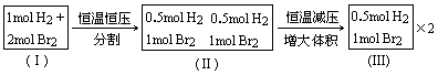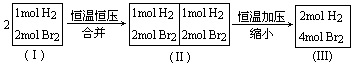 因为由 (Ⅰ)→(Ⅱ)过程的条件不变,所以(Ⅰ)与(Ⅱ)属同一平衡状态,各物质的百分含量不变,(Ⅱ)与(Ⅰ)具有相同的转化率;(Ⅱ)→(Ⅲ)的过程可看作增大压强,而该反应前后气体体积不变,所以平衡不发生移动,转化率不变,只是各物质的物质的量相应扩大为已知状态的2倍,故状态①平衡时HBr的物质的量为2a mol.可用“分割法’对比“已知状态”和“状态②”的平衡状态: