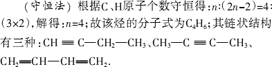 通式为 CnH2n-2的一种气态烃完全燃烧后生成CO2和H2O的物质的量之比为4∶3,这种烃的链状同分异构体有(已知不存在一个C原子上连有两个双键的物质) | |