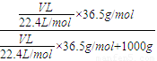 ②1.00L水(密度:1.00g?cm-3)的质量为1000g,设HCl气体的体积为VL,则
