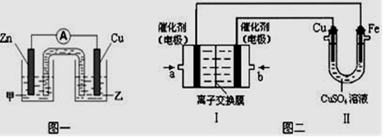 ①图一是根据反应Zn + CuSO4== Cu + ZnSO4设计成的锌铜原电池。Cu极的电极反应式是 ,盐桥中是含有琼胶的KCl饱和溶液,电池工作时K+向 移动(填“甲”或“乙”)。