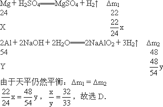 在托盘天平的两个托盘上各放一个质量相等的烧杯,使天平平衡,在烧杯中分别放入等质量的硫酸溶液和NaOH溶液(均为足量).向H2SO4溶液中加入镁粉,向NaOH溶液中加入铝粉,若使天平继续保持平衡,加入镁粉和铝粉的质量比为 | |