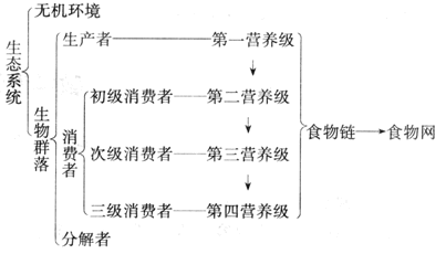 生态系统、食物链、食物网、生产者、消费者、分解者、生物群落、初级消费者、次级消费者、三级消费者、第一营养级、第二营养级、第三营养级、第四营养级。