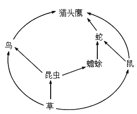 某温带草原里有鸟、鼠、昆虫、猫头鹰、蟾蜍和蛇等六种动物,它们相互间的关系是:①猫头鹰捕食蛇、鼠、鸟;②昆虫、鸟及鼠以植物的各种器官为食;③蟾蜍和鸟捕食昆虫;④蛇吞食蟾蜍和鼠。请回答:
