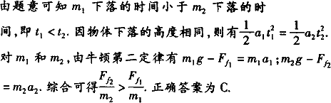 质量分别为m1和m2的两个物体,从同一高度同时由静止开始下落.下落过程中受到的空气阻力分别为Ff1和Ff2,如果质量为m1的物体先落到地面,可能是因为