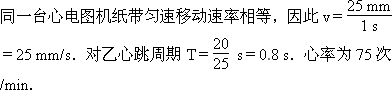 心电图是现代医疗诊断的重要手段,医生从心电图上测量出相邻两波峰的时间间隔,即为心动周期,由此可以计算出1分钟内心脏跳动的次数(即心率),甲、乙两人在同一台心电图机上做出的心电图如图所示,医生通过测量后记下甲的心率是60次/分,则由二图及甲的心率可知心电图机图纸移动的速度v以及乙的心率为