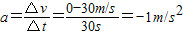 解答:解:速度时间图线是一条向下倾斜的直线,表示物体做匀减速直线运动,t=0时的速度为30m/s,直线的斜率表示加速度,任意一段时间内的平均加速度等于任意一个时刻的瞬时加速度,故加速度为