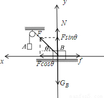 【答案】分析:物体A处于平衡状态,所以绳对A的拉力就等于A受到的重力,同一根绳子上的力大小相同,对B受力分析,应用平衡条件列式求解摩擦力和支持力.
