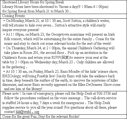 Library Hours have been shortened to 7hours a day(9∶00am-4∶00pm)for Spring Break from March 21 to March 30.